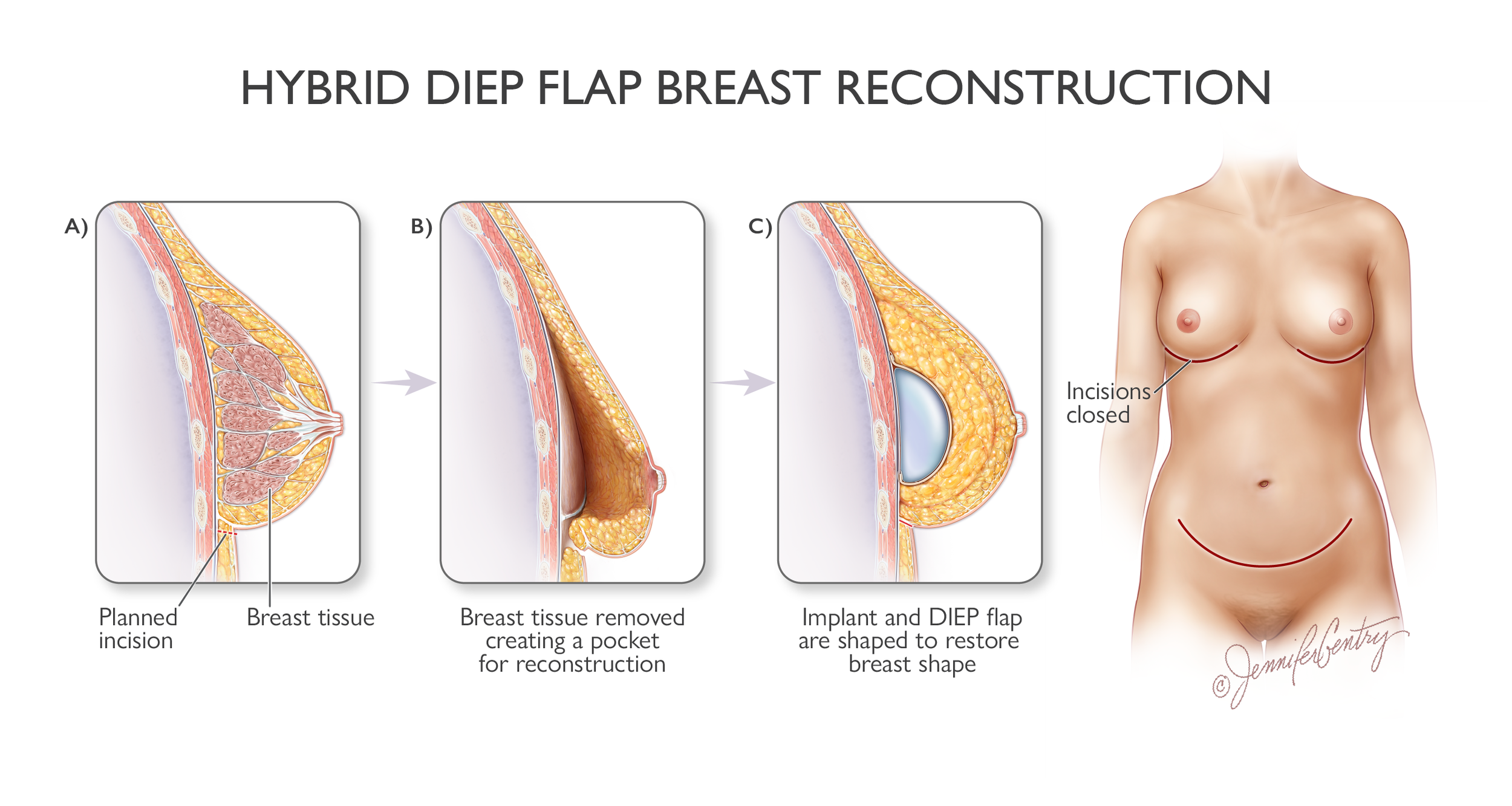Hybrid breast reconstruction is a reconstruction method that combines your own natural tissue (flap) with a breast implant to create a softer, more natural breast shape with added volume or projection.